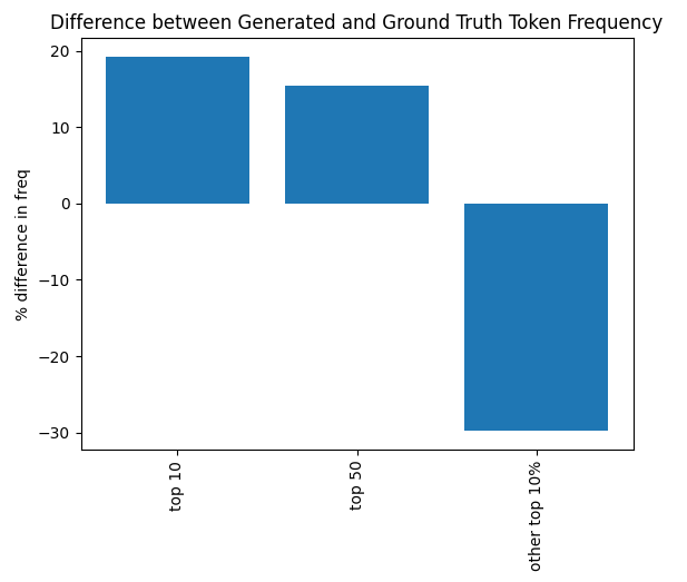The labels on the bottom of the bar graph indicate how often a token appeared among all possible tokens. My data sample was very small due to compute and time limitations, so as a result the vast majority of tokens allowed were not even generated or present in the ground truth data. The percent in the graph indicates the increase from ground truth to generated, so 20% for top 10 means that the top 10 tokens in the ground truth were 20% more common in the generated data.